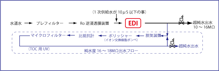 よって、18MΩまでの溶解イオン除去が必要な場合は、脱気装置や、EDIの後段にポリッシャー(イオン交換樹脂のボンベ付加)が必要に成ります。 |